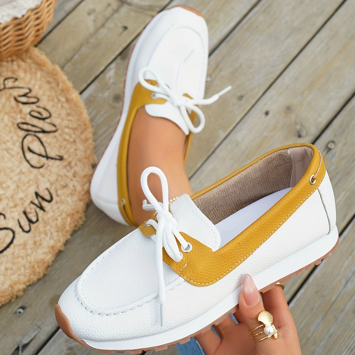 Voeg een vleugje eenvoudige elegantie toe aan je garderobe met deze Dames Slip-On Loafers in wit met gele accenten. Deze casual schoenen met synthetisch bovenwerk en duurzame rubberen zool bieden all-season comfort en een gestroomlijnd design. Perfect voor dagelijks gebruik, van stadswandelingen tot relaxte uitjes, met een tijdloze, comfortabele pasvorm.